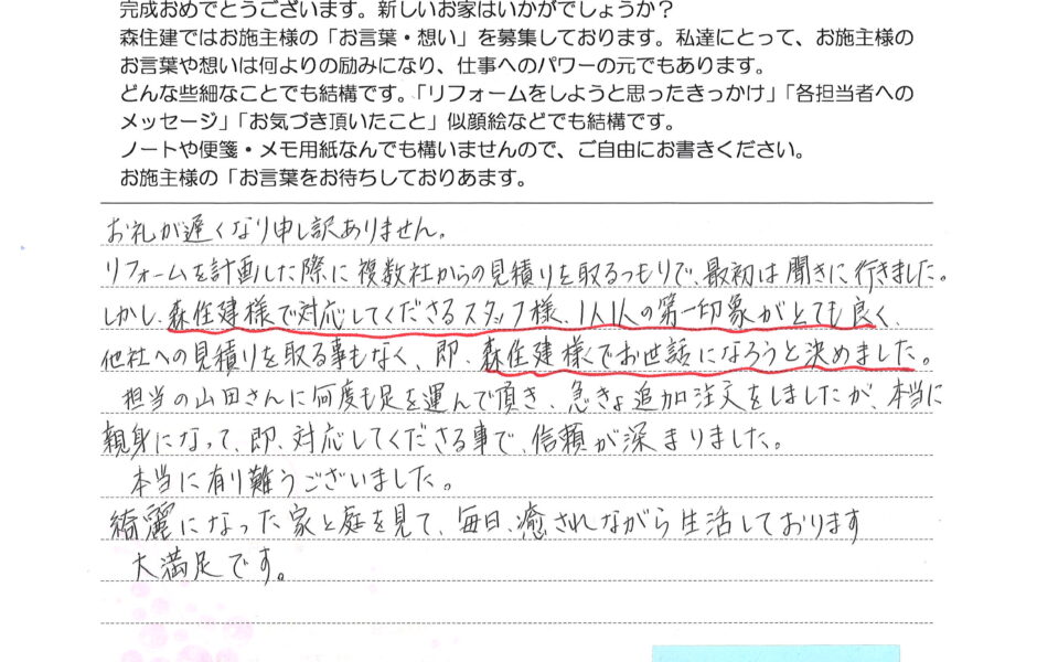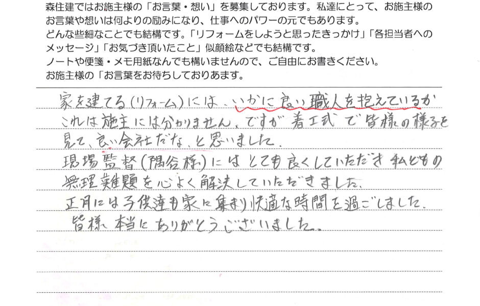 ご安心ください。森住建のリノベLABO(リノベラボ)では、一番お客様と接する事の多い職人さんには、しっかりとしたマナー教育を行っております。 お客様が気持ちよく家が完成するまでを見守る事が出来るように、心のこもった家づくりをお約束します。