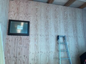 外壁に面材(合板)を張り耐震に強いように外壁周りも並行して工事進めています。