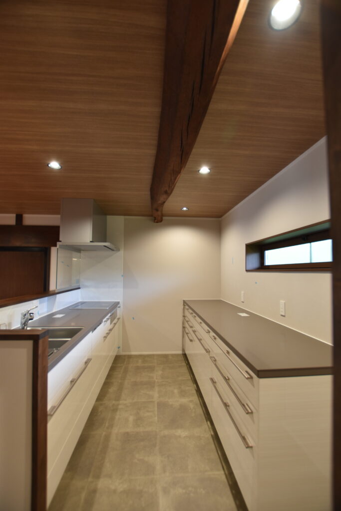 床材は耐水性・耐久性を考えフロアタイルを採用しました。キッチン上に見える梁が良い雰囲気を出しています。