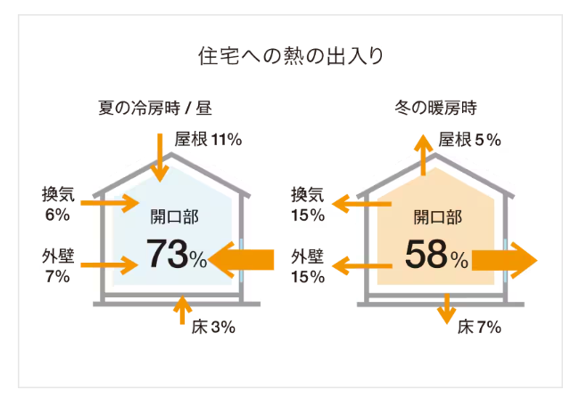 住宅への熱の出入りは、開口部(窓や玄関ドアなど)からが半分以上を占めています