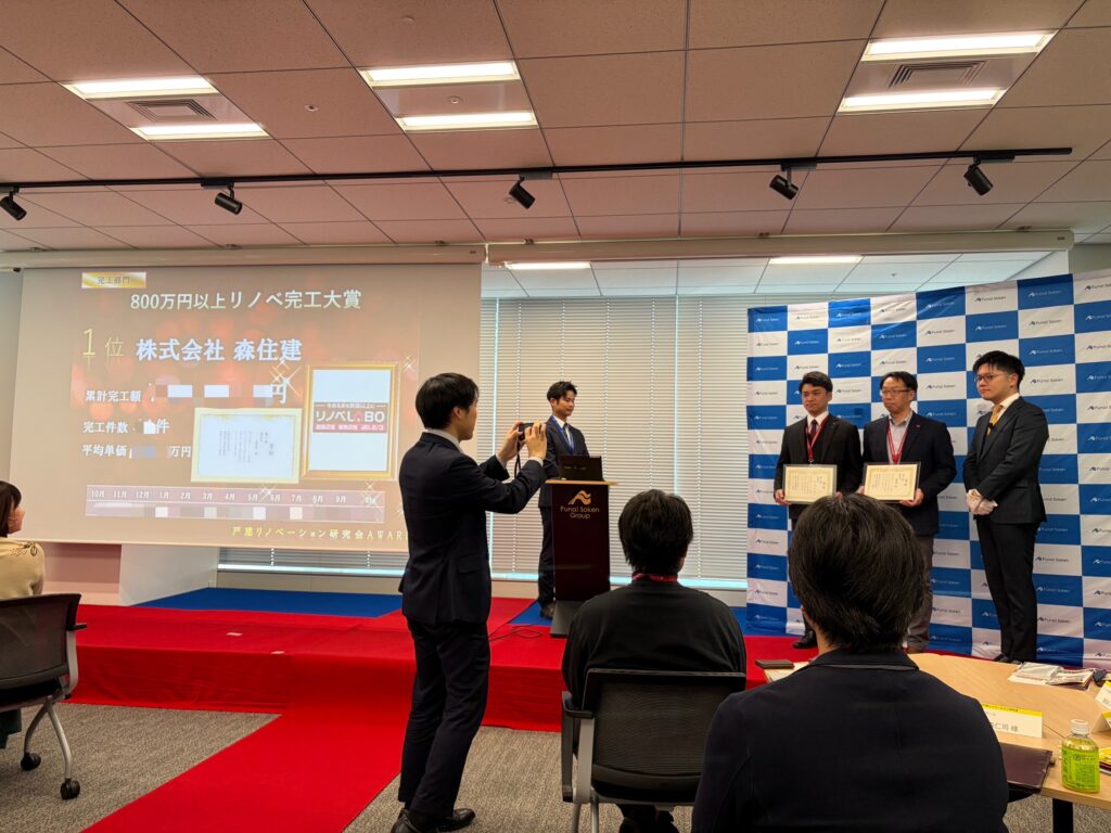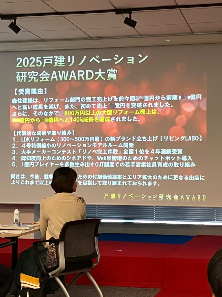 こちらの賞は戸建リノベーション研究会の中で最も積極的に戸建リノベーションモデルを推進し、研究会を代表するモデル企業としてふさわしい会社に送られる賞との事で本当にうれしい限りです。