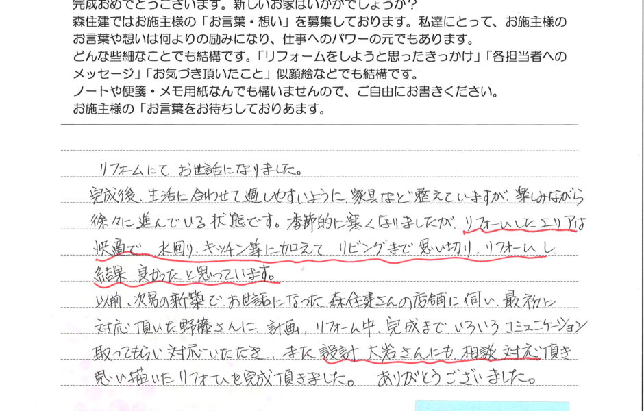 ご安心ください。森住建のリノベLABO(リノベラボ)では、一番お客様と接する事の多い職人さんには、しっかりとしたマナー教育を行っております。 お客様が気持ちよく家が完成するまでを見守る事が出来るように、心のこもった家づくりをお約束します。
